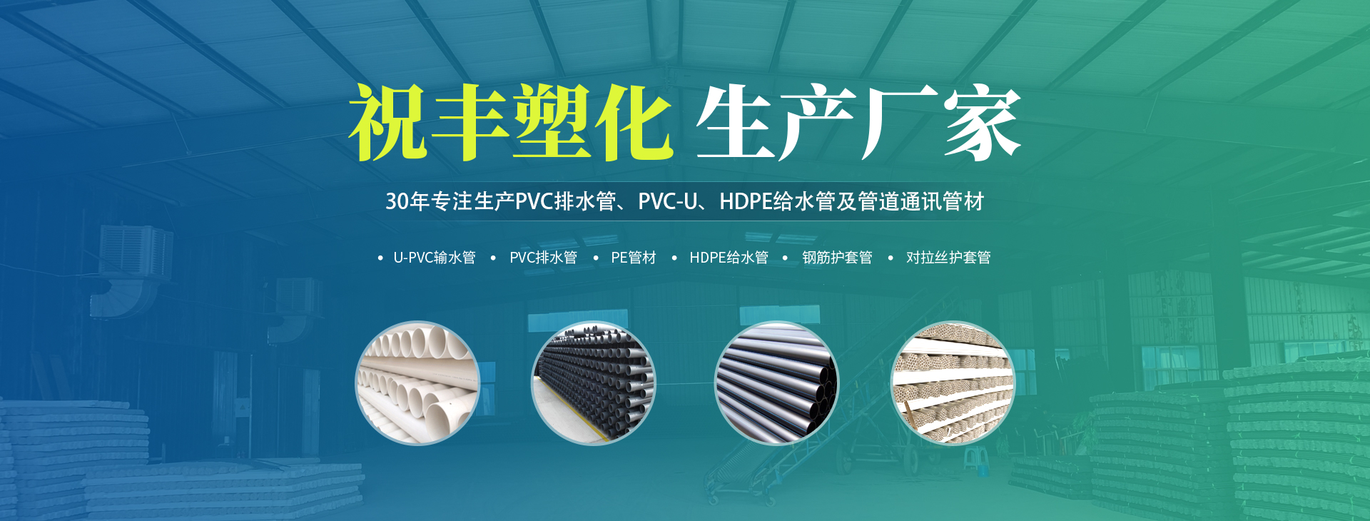 安陽市祝豐塑化有限公司坐落在滑縣工業(yè)園區(qū),東臨大廣高速,西臨京珠高速,是鄭州、鶴壁、安陽、濮陽四個城市的輸紐,交通便利、環(huán)境優(yōu)美。       公司始建于八十年代,經過二十余年的艱辛創(chuàng)業(yè),規(guī)模不斷壯大,由十多萬元資產的小廠,發(fā)展到現(xiàn)占地面積達一萬多平,建筑面積一萬平,資產2000多萬元管材生產企業(yè)。公司生產PVC-U、PVC排水管、HDPE給水管、鋼筋護套管管道通訊管材等產品,廣泛用于農田節(jié)水、高山引水、人畜用水、建筑、電力通訊等多種用途,品種齊全。為了滿足用戶需求,可承攬各種給水、節(jié)水、灌溉工程。“祝豐塑化”憑借強勁的實力,優(yōu)良的管理水平。“以質量求生存,以信譽求發(fā)展”的原則全力以赴和大家共同塑造美好未來。..